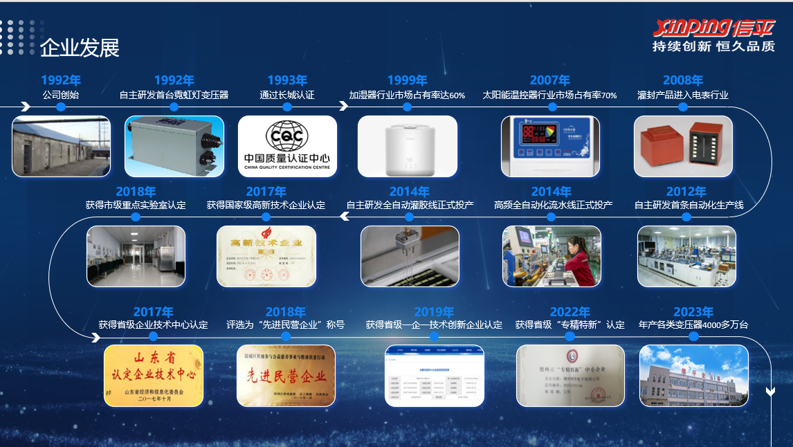 德州信平电子有限公司是一家专注于各类精密电子变压器制造的国家级高新技术企业,公司创立于2001年3月,拥有多年专业变压器制造经验。公司位于山东德州天衢新区。